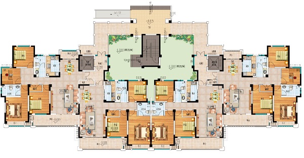 突出入戶大堂、小區入口。廣場地面雕刻出方磚鋪地,運用人工分色處理,打磨噴涂上色;點綴一些汽車、行人、休憩椅、雕塑小品及各種植物等環境配套設施使商業廣場更添休閑味道,環境更加豐富。并在廣場設置地燈及燈光以增加模型夜景效果。在總體協調的基礎上,盡量提高空間感和視覺效果,按照實際施工尺寸適當拉寬環境及建筑樓距,適當放大中心園林空間,以獲得更感性合理的模型視覺(多設置公園椅、庭園燈、樹木等),充分體現出城市自然與人文環境相互融合的特性。